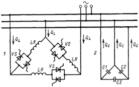 Реактивная мощность Q, выдаваемая такой установкой в сеть, регулируется переменной реактивной мощностью индуктивности QL, т. е. Q = QC – QL, где QC – мощность БК.