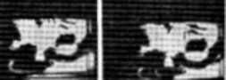 Несколько другим представляется отображение в трех измерениях ряда двумерных «срезов» (вместо различных фокальных плоскостей, которые обычно содержат случайные помехи, обусловленные дефокусировкой изображений в других плоскостях). Ультразвуковое сканирование типа В позволяет получить такие двумерные изображения, так же как и проективная томография. Таким образом, цель псевдопараллакса состоит в предоставлении возможности наблюдателю получать основные сведения о трехмерных в действительности соотношениях из серии двумерных изображений. Эти концепции были предложены Редманем [1.39] и затем развиты другими исследователями [1.40, 41]. На рис. 4.1. приведен ряд различных изображений одного и того же объекта, полученных с одной голограммы. Отдельные плоскости представляют собой расположенные на одинаковых расстояниях и параллельно друг другу «срезы» (ультразвуковое сканирование типа В) через оба глаза. Темное пятно выше одного глаза указывает на наличие рака. С помощью псевдопараллакснческих голограмм можно установить размеры, форму и местоположение раковой опухоли.
