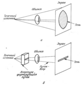 Рис. 8.1. Точечный источник создает конус направленных на объект лучен, которые и образуют на экране его теневое изображение (а). Если между точечным источником и объектом поместить щелевую диафрагму, то объект будет освещаться только веером лучей. В этом случае мы имеем трансаксиальное освещение, показанное на нижнем рисунке (б).