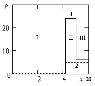 | Рис.5. Зависимость относительной плотности радиоактивного вещества в пористой среде от пространственной координаты в фиксированный момент времени: I – промытая зона, II – зона радиогеохимического эффекта; III – нефтенасыщенная зона; 1 – результирующие значения плотности в пористой среде, 2 – составляющая плотности в скелете |