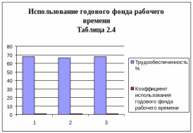 Трудообеспеченность в 2002 и 2004 году составила 68%, а в 2003 году 66,3%. Численность временных колхозных работников не снижается.100% использования фонда рабочего времени наблюдается в 2004 году, по составленным годам коэффициент перешагнул 100% барьер. Нормативный