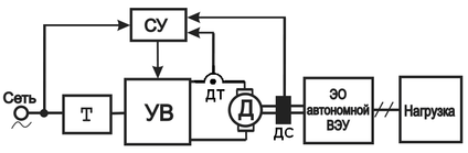 Обобщенная структурная схема ВЭУ приведена на рис. 1.9. АЭП имитатора должен реализовывать механические характеристики различных ветротурбин MД = f(Д, VВ) с учетом мультипликатора (М) при заданных скоростях ветрового потока (ВП). При этом математическое описание параметров ВП может быть получена вероятностными методами.