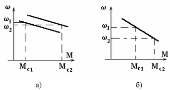 Понятие “регулирование скорости”, когда используются разные характеристики (рис. 2.5, а), не следует смешивать с изменением скорости, даже значительным, которое вызывается ростом или снижением нагрузки и происходит в соответствии с формой данной механической характеристики (рис. 2.5, б).