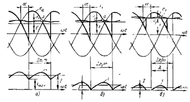 При рассмотрении механических характеристик предполагалось, что преобразователь всегда работает в режиме непрерывного выпрямленного тока (тока якорной цепи) – диаграмма тока на рис. 2.12, а. Фактически же при малых моментах нагрузки на валу двигателя в кривой выпрямленного тока i появляются разрывы и ток становится прерывистым (рис, 2.12, в). Рисунок 2.12, б относится к граничному случаю.