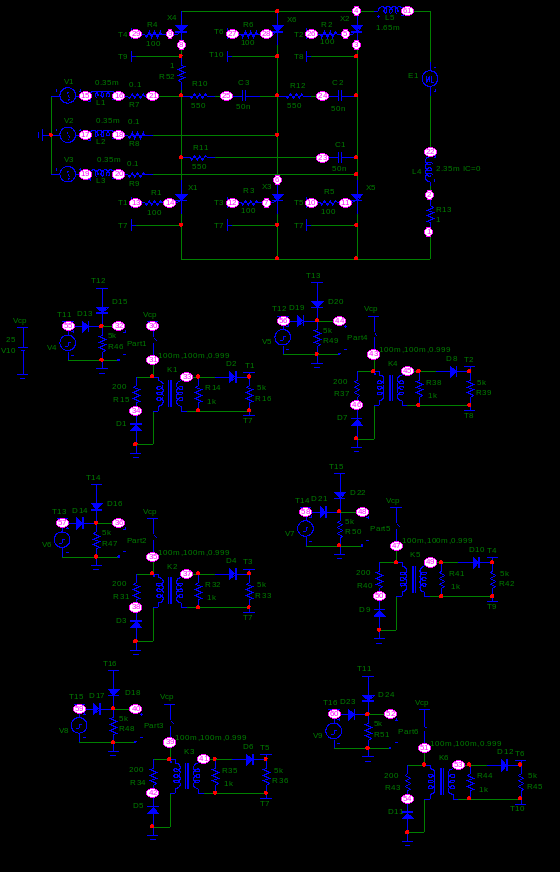 Для построения семейства внешних характеристик при определенных углах управления α необходимо в окне параметров источников V1, V2, V3 (рис. 4.2) изменять значение начальной фазы РН.