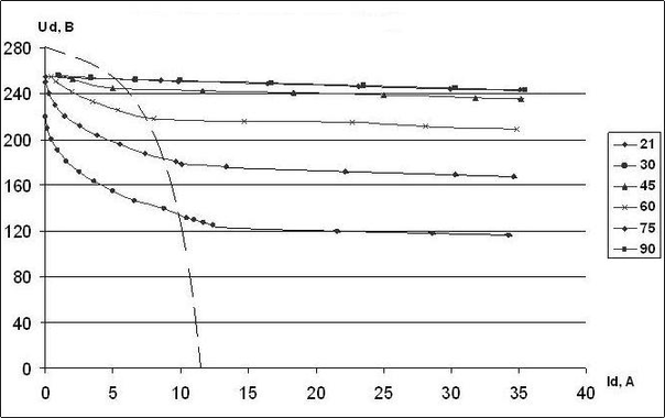 | α, град. | Id, А | Ud, В | α, град. | Id, А | Ud, В |