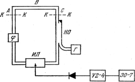Из отрезков 3-см волновода, разной формы собирается волноводное кольцо, в которое включены направленный ответвитель НО, 3-см измерительная линия ИЛ и диэлектрический фазовращатель φ. 3-см электромагнитные волны, модулированные по амплитуде низкой частотой (400 гц), поступают в кольцо от генератора Г, волноводный выход которого стыкован со входом направленного ответвителя. Диэлектрический фазовращатель позволяет менять электрическую длину контура. Детектор в зонде измерительной линии регистрирует амплитуду волны в данной точке контура. От зонда продетектированный сигнал через усилитель низкой частоты поступает на вход осциллографа ЭО-7.