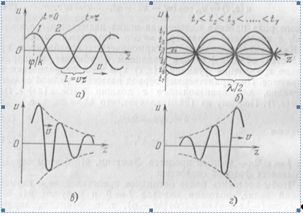 . Ряд «мгновенных снимков» процесса для разных моментов времени дает картину, показанную на рис. 1.2б; косинусоидальное распределение и вдоль оси