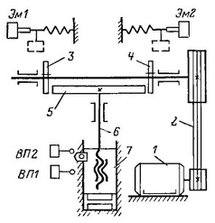 На рисунке 1.1 показана упрощенная кинематическая схема фрикционного пресса. Двигатель 1 через клиноременную передачу 2 непрерывно вращает два диска 3 и 4, которые попеременно прижимаются к маховику 5, сидящему на вертикальном винте 6, связанном с ползуном 7. Перемещение дисков производится пневмосистемой, управление которой осуществляется электромагнитами Эм1 и Эм2. При включении электромагнита Эм1 к маховику прижимается диск 3, и ползун движется вниз; когда сработает Эм2, то диском 4 маховик будет вращаться в обратную сторону, и ползун станет перемещаться вверх.