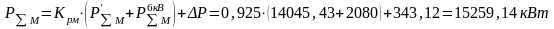 При определении суммарной нагрузки по фабрики в целом необходимо учесть коэффициент разновремённости максимумов Крм, значение которого равно 0,925,а также потери в силовых трансформаторах, которые еще не выбраны, по этому эти потери учитываются приближенно по ниже следующим выражениям.
