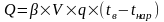 | № | Объект | β | V, м³ | q, т/(м³∙К) | tвн, ºС | tнарС | Q, Вт | |||||||
