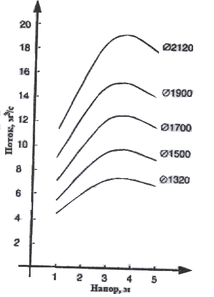 Застосування РТ-турбін, як малих гідроустановок, є економічно виправданим, коли є витрати води вище 30 літрів у секунду з напором від 20 м. Необхідне співвідношення H, Q і необхідної потужності РТ-турбіни наведене на мал. 3.2. Діаметр лопаток колеса турбіни D показаний на мал. 3.3. Величина діаметра залежить від значення напору Н, потоку Q і від наведеної швидкості nс: