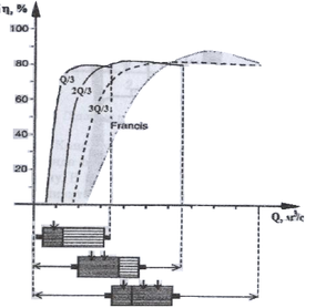 МВТ-турбіни конструктивно використовують вільний випуск води або випуск із труби секційного типу. На рис. 3.6 показана турбіна із проходженням води навколо її ротора. У порівнянні з іншими видами турбін МВТ може мати сегментне компонування ротора (поздовжніх осередків ротора), що надає цим турбінам великої переваги. МВТ-турбіни можуть компонуватися декількома осередками. При низьких або середніх потоках води вони працюють із однієї або двома із трьох наявних осередків. Для одержання повної потужності при проектних потоках води використовуються три із трьох осередків. При такій диспозиції можна використати будь-який потік води з відносно оптимальною ефективністю. Завдяки такій можливості турбіна може бути використана навіть при 20% від повної потужності. Ця особливість важлива для проектів, коли можливо поступове задоволення попиту на електроенергію в часі. У цих випадках мала гідроустановка досягає видачі повного потенціалу енергії тільки через деякий час. Головні переваги МВТ це швидке компонування осередків і легкий доступ до всіх елементів устаткування протягом усього часу їхнього обслуговування. На мал. 3.7 наведені залежності ККД від Q МВТ-турбін при різній кількості осередків (сегментів) у порівнянні з FТ-турбіною.