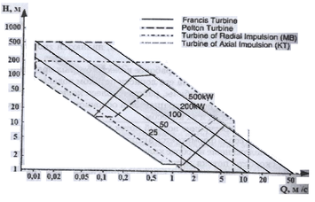 Вибір типу турбіни залежить від цілого ряду показників, насамперед від висоти потоку бігу води й інших показників, таких як вартість турбіни й експлуатаційні витрати, надійність та інше. На мал. 3.2 наведені границі застосування вищезгаданих турбін, що рекомендуються, залежно від напору, обсягу води, а також потужності кожної машини.