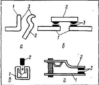 а — пальцові; б — місткові; в — врубні; г — з плоскими пружинами; 1 — нерухомий контакт; 2 — рухомий контакт; з — контактуючі поверхні
