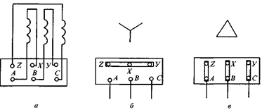 Оскільки номінальна напруга двигуна має дорівнювати номінальній напрузі мережі, то залежно від цієї напруги обмотку статора з'єднують у зірку або трикутник (рис. 3, б, в).