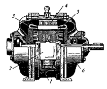 1-корпус статора; 2-коробка із затискачами; 3-обмотка статора; 4-осердя статора; 5-ротор; 6-підшипниковий щит