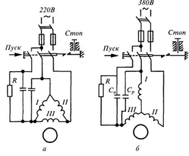 Рис. 5. Схеми вмикання трифазного двигуна напругою 380/220 В у однофазну мережу напругою 220 В (а) і 380 або 440 В (б)