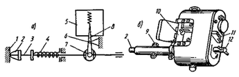При оглядах електроприводів звертають увагу на вібрацію і при необхідних випадках її замірять. Найбільш простий і зручний для виміру вібрацій при експлуатації віброметр типу ВР. Віброметр допускає вимір вібрацій від 0,05 до 6 мм у машин з частотою обертання більш 750 об/хв і має записуючий пристрій. У найбільш розповсюдженій конструкції вібрографа запис виробляється сталевим пером 8 (рис. 7, а) на паперовій стрічці 5, що пересувається з визначеною швидкістю за допомогою годинного механізму з пружинним заводом. Відмітчик часу робить оцінку на стрічці щосекунди, що дає можливість визначити частоту вібрацій. Вібрації від контрольованої поверхні 1 передаються через наконечник 2, що закріплений на осі 3 і притискається до поверхні пружиною 4. Вісь за допомогою шарніра 7 зв'язана з пером, закріпленим на осі 6. Гвинт 9 (рис. 7, б) передбачений для регулювання натягу пружини, щоб забезпечити надійний контакт між штифтом і вібруючою поверхнею. За рухом пера спостерігають через лючок 10 у корпусі. Пружину годинного механізму заводять рукояткою 12. Важілець 11 служить для включення і відключення руху стрічки відмітчика часу.