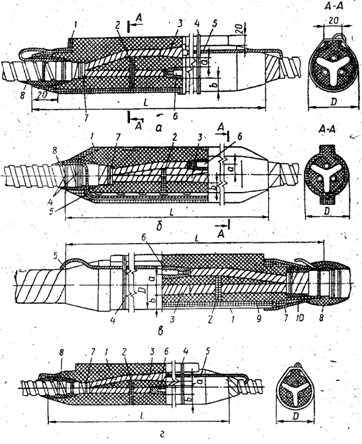 а – СЕп; б – СЕв; в – СЕм; г – СЕс; 1 – корпус муфти; 2 – розпірка; 5 — підмотка жили, 4 — бандаж з дроту; 5 — провід заземлення; 6 — з'єднання жил; 7 — бандаж з сурових ниток; 8 — герметизуюча підмотка; 9 — екран корпусу; 10 — свинцева манжета
