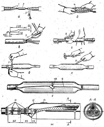 а, б, в, г, д, е, є, ж — послідовність операцій; 1 — ступені обробки заводської ізоляції; 2 – гільза; 3 — сталева струна з важками; 4 — паперова стрічка; 5 — розбортування; 6 — дерев'яний валик; 7 — паличка припою; 8 — ніж; 9 – заземлюючий провід; 10 — ділянка приєднайся заземлюючого проводу до корпусу муфти; 11 — дротяні бандажі; 12 — корпус муфти; 13 — заливальний отвір, закритий пластиною свинцю
