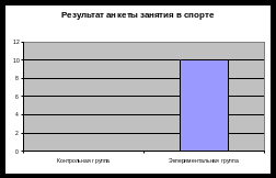 По данной анкете выявлено, что дети из контрольной группы не занимаются никаким из видов спорта, кроме как уроки физкультуры, а экспериментальная группа занимается спортом и большинство из исследуемых имеет разряд по спорту.