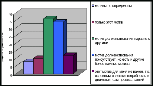 Из исследования, проведенного Селецкой на базе ДВГУЭиС видно, что в данном случае на первое место выходит мотив долженствования, 85% респондентов посещают занятия физической культурой ради получения зачета. Из второстепенных мотивов [44]: