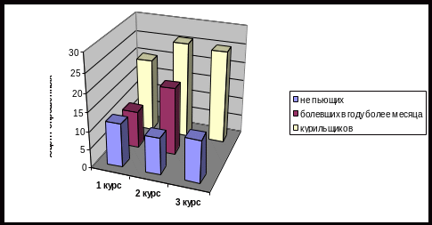 В настоящее время значительно сократилось количество практически здоровых студентов. Хроминой и Шумаховой было проведено исследование состояние здоровья студентов различных курсов на базе ХГАЭиП. В исследовании приняло участие 331 студент (57,8% первокурсников, 69,1% второкурсников и 60,7% третьекурсников) [50]: