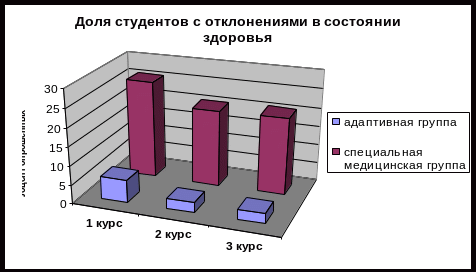 Для студенчества характерен недостаточный уровень функциональных резервов для поддержания здоровья на должном уровне в процессе обучения и как следствие – наличие 8-12% студентов, имеющих выраженные отклонения в состоянии здоровья. В процессе обучения выявлена тенденция ухудшения антропометрических показателей (по данным исследования Чоговадзе и Рыжак), увеличение с 1,7% до 3,6% числа студентов с выраженным фактором риска сердечно-сосудистых заболеваний. По энергозатратам у 50% студентов мышечная активность ниже рекомендуемой на 15-30% [51].