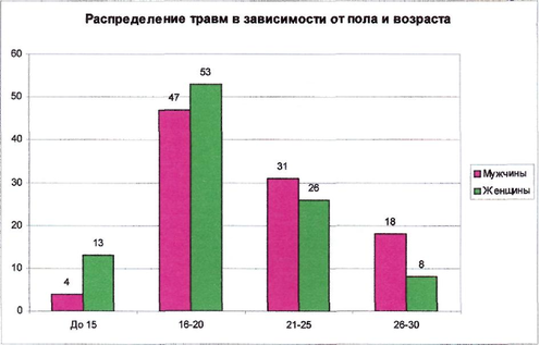Анализ обращаемости за специализированной помощью, показал, что основной контингент пациентов в возрасте 15-24 года (70%), т.е. это период спортивного совершенствования и спорта высших достижений. Выявлена неодинаковая обращаемость и по половому признаку.