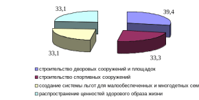 В качестве мер по решению данных проблем жители города предлагают: строительство дворовых сооружений и площадок - 39,4%; строительство спортивных сооружений - 33,3%, создание системы льгот для малообеспеченных и многодетных семей, а также распространение ценностей здорового образа жизни по 33,1% (рисунок 26).
