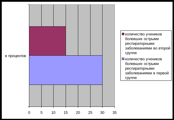 Результаты исследования в процентном подсчёте выглядят следующим образом. 30% учеников из первой контрольной группы, которая не занималась по специальной программе, перенесли острые респираторные заболевания. Из этих данных мы сделали вывод, 70% учеников не болели острыми респираторными заболеваниями. Во второй группе, которая занималась по специальной программе, острые респираторные заболевания перенесли 15% школьников, не болели острыми респираторными заболеваниями 85% учащихся.