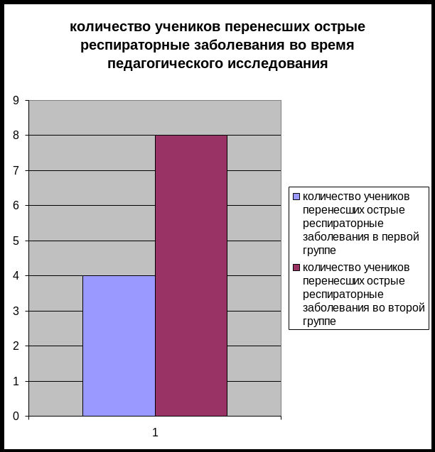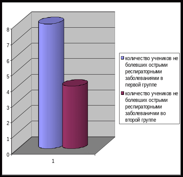 Педагогические исследование заключалось: класс был разделен на две контрольные группы, первая контрольная группа занималась только на уроках физической культуры, а вторая контрольная группа занималась упражнениями на укрепление дыхательной системы и профилактику острых респираторных заболеваний в течение пяти недель. Занятия проходили по 40 минут три раза в неделю. Через три недели после проведения основной части по медицинским справкам, взятым из школьного журнала, мы их подсчитали и установили число школьников, которые перенесли острые респираторные заболевания в каждой из контрольных групп. За восемь недель проведения исследования получились следующие результаты. Из второй контрольной группы, которая занималась по специальной программе, острые респираторные заболевания перенесли 4 учащихся, а в группе, которая занималась, не занималась, перенесли острое респираторное заболевание 8 учеников. В процентном эквиваленте эти цифры выглядят следящим образом. Приложение таблица №1.