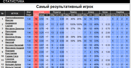 Прием рассматривает общее количество принятых мячей, ошибок, а так же количество позитивного и отличного приема в процентах. Блок разделен на ошибки и принесенные очки. Снизу подсчитаны результаты всей команды.