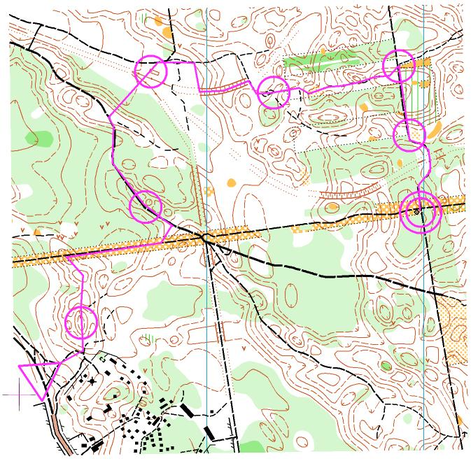 Образец карты с помощью которой производилось тестирование технического элемента «Чтение карты» в контрольной и экспериментальной группах для спортсменов ориентировщиков на этапе начальной спортивной специализации. Фрагмент карты с отметкой.