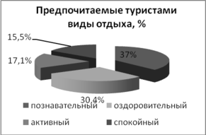 Наиболее предпочитаемыми видами отдыха являются познавательный 37% и оздоровительный 30,4%, активно проводить свой отдых предпочитают 17,1%, спокойно отдыхать предпочитают 15,5% (см. Диаграмму 3).