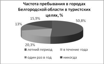 На вопрос «Как часто Вы бываете в городах Белгородской области в туристских целях?», большинство респондентов ответили, что часто бывают в летний период – 50,8%, в течение года – 20,3%, один раз в год – 13% и никогда не бывают – 15,9% (см. Диаграмму 6).