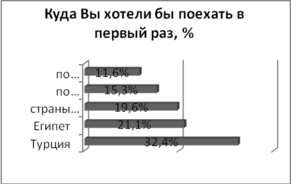 На вопрос «Куда Вы хотели бы поехать в первый раз?» 32,4% хотели бы поехать в Турцию, 21,1% – в Египет, страны Европы – 19,6%, по городам России – 15,3%, и всего 11,6% в районы области (см. Диаграмму 4).