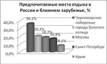 Наибольшей популярностью у жителей Белгородской области пользуются Черноморское побережье – 36,1%, города Золотого кольца – 20,3%, Москва – 18,7%, Санкт-Петербург – 16,8%, Крым – 8,1% (см. Диаграмму 5).