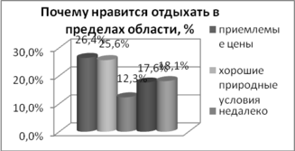 Согласно результатам исследования в пределах области в туристских целях бывают 37% респондентов, проживающих на территории региона. Основная причина, по которой они выбирают отдых вблизи от дома: приемлемые цены 26,4%, хорошие природные условия 25,6%, не надо далеко ехать 12,3%. При этом 17,6% привыкли отдыхать в области, а 18,1% связывают такой отдых с возможностью провести время с близкими людьми (см. Диаграмму 2).