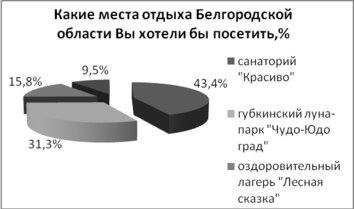 На вопрос «Какие места отдыха Белгородской области Вы хотели бы посетить?» больше всего респондентов выбрали санаторий «Красиво» – 43,4% и губкинский луна-парк «Чудо-Юдо град» – 31,3%, оздоровительный лагерь «Лесная сказка» – 15,8%,а количество респондентов, которые ничего не хотели бы посетить составило – 9,5% (см. Диаграмму 9).