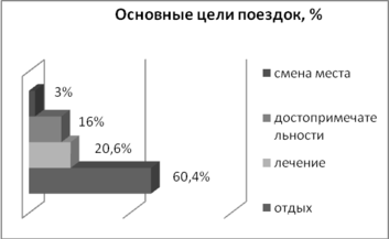 Основной целью путешествий жителей области является отдых – 60,4%, лечение – 20,6%, достопримечательности – 16%, смена места – 3% (см. Диаграмму 7).