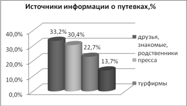 Основными источниками информации о путевках, по словам респондентов, являются друзья, знакомые, родственники – 33,2%, пресса – 30,4%, турфирмы – 22,7%, телевидение и радио – 13,7% (см. Диаграмму 10).