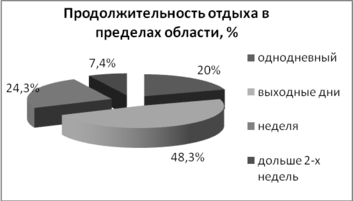 На вопрос «Какова была бы продолжительность Вашего отдыха, если бы Вы проводили свой отпуск в пределах области?» 48,3% – провели бы свои выходные в пределах области; 20% – отдыхали бы один день, 24,3% – отдыхали бы неделю, 7,4% – дольше двух недель (см. Диаграмму 8).