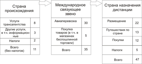 Анализируя схему 1, предположим, что существуют только туристические компании А, В и С. Они являются национальными производителями туристических продуктов в одноименных странах и не имеют зарубежных филиалов. Компания А размещается в стране генерирующей туристский поток, и предоставляет весь комплекс услуг, связанных с выездом граждан за границу. Компания С базируется в стране назначения. Она организует прием интуристов и обслуживание. Компания В принадлежит третьей стране, по территории которой туристы следуют транзитом. Эта фирма обеспечивает перевозку пассажиров из страны А в страну С через В. Если бы каждая компания имела возможность приобрести две другие, то компания А получила бы доход 11 + 35 + 47 = 93% вместо прежних 11%.