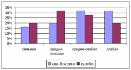 В ходе исследования были получены результаты, свидетельствующие о преобладании в группе кик-боксеров подростков со средне - слабым (32%) и слабым типом (32%) нервной системы (р<0,05), а в группе самбистов, подростков со средне- сильным (32% р<0,05) и средне-слабым (28%) типом нервной системы (р<0,05). Можно предположить, такое распределение обусловлено спецификой вида спорта, который выбран подростками.