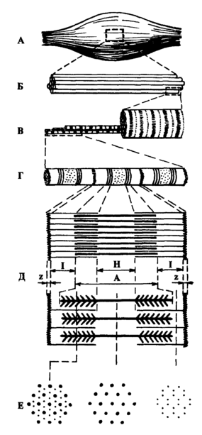 Рис. 2. Схематическое изображение строения мышцы. А - мышца; Б - пучок мышечных волокон; В - мышечное волокно; Г - миофибрилла; Д - схематическое изображение саркомера, ограничено Z-линиями, с 1-дисками, А-дисками и Н-зоной; Е - поперечный срез на различных участках саркомера, дающий представление о распределении тонких и толстых нитей актина и миозина (по Я. Коцу).