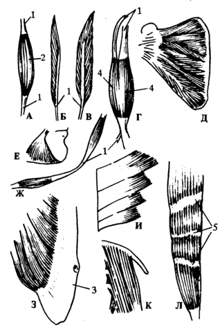 Л - мышца с сухожильными перемычками: 1 - сухожилие; 2 - брюшко мышцы; 3 - апоневроз; 4 - головка мышцы; 5 -сухожильная перемычка (по Синельникову Р. Д., Синельникову Я. Р., 1989).