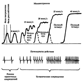 В связи с этим, необходимая для полного титанического сокращения ДЕ частота импульсации мотонейрона зависит и от типа составляющих ее мышечных волокон.