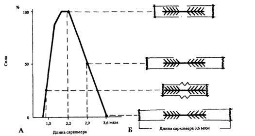Если же мышцу растягивать более, чем ее длина в покое, то сократительная сила также уменьшается, потому что нити актина при этом вытягиваются из пучка нитей миозина. Поэтому, при увеличении длины саркомера до 2,9 мкм, мышечное волокно сможет развить только около 50% от своего изометрического максимума, так как зона взаимного перекрытия сократительных элементов составляет лишь половину от максимальной. При длине саркомера 3,6 мкм и более миофибриллы уже не могут генерировать силу, потому что их актиновые и миозиновые нити не перекрываются (25).